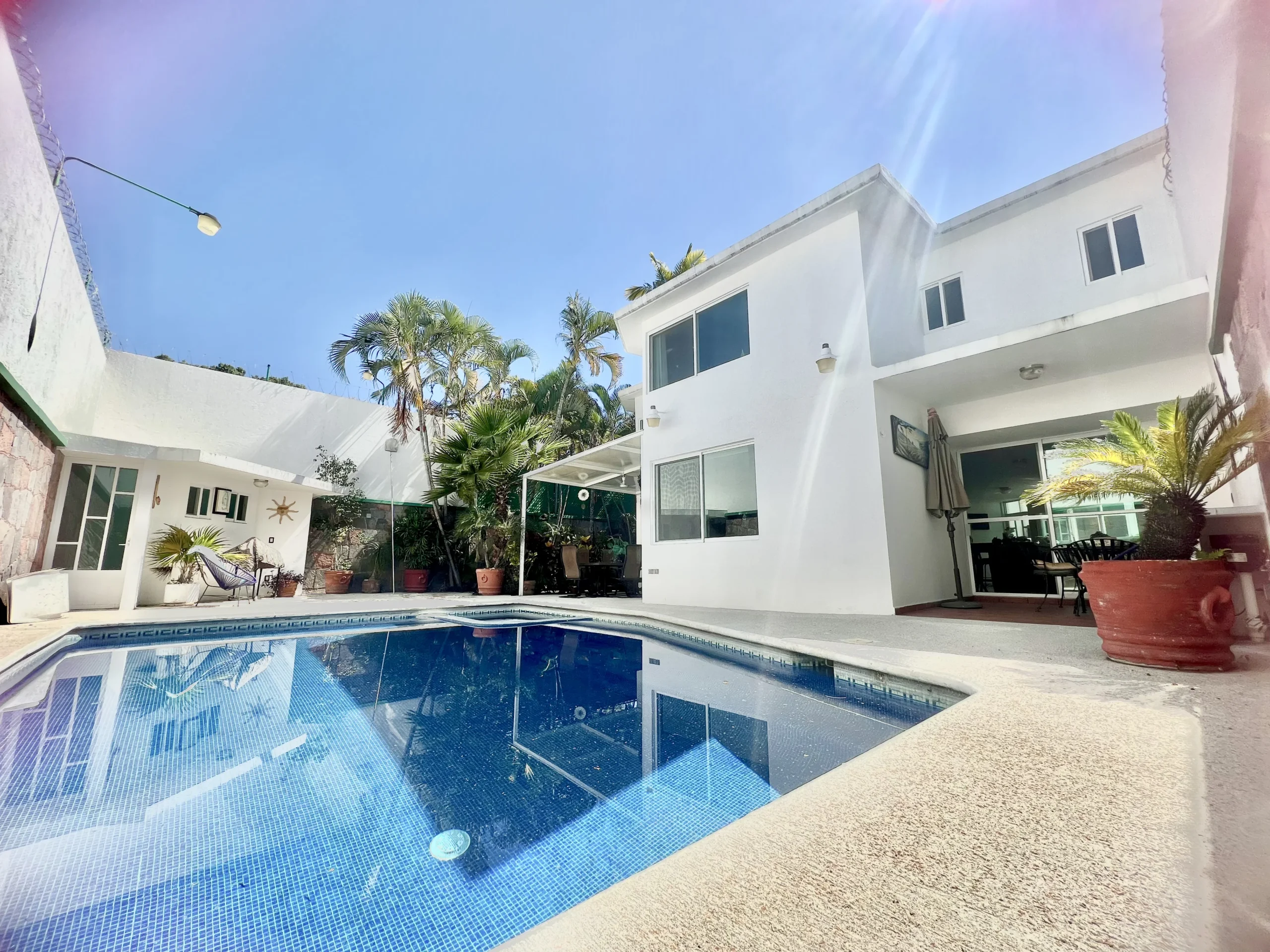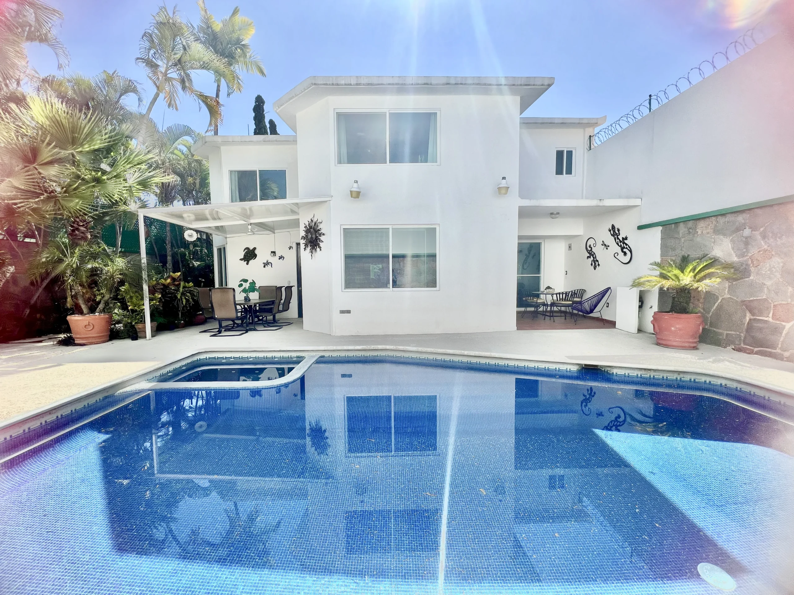 Cuenta con 2 lugares de estacionamiento dentro de la casa, garaje semi techado jardín privado, alberca con jacuzzi.